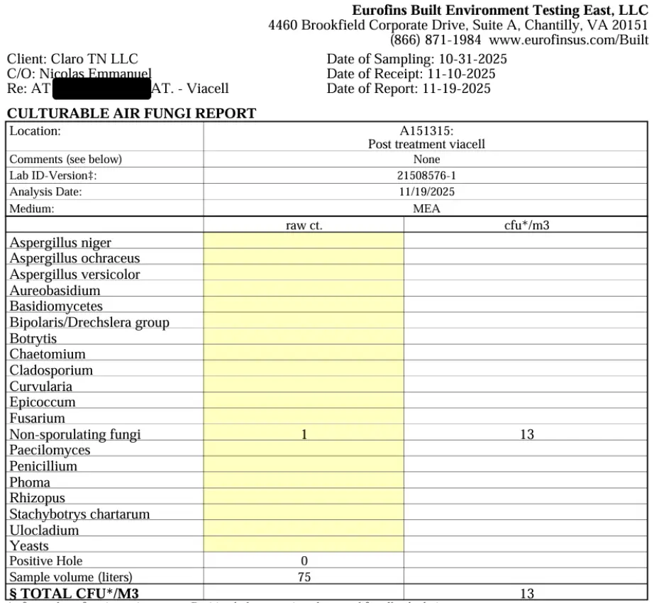 Post-treatment testing confirmed complete remediation: total culturable fungi dropped to just 13 CFU/m³—essentially undetectable and well below any concern threshold. All problematic mold species were eliminated, and the home's air quality returned to normal, healthy levels.