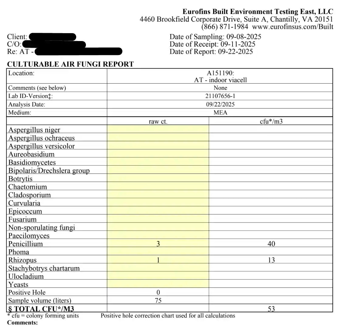 Our team performed a full inspection followed by laboratory testing. Results revealed Stachybotrys along with other contamination markers, confirming that mold was present at concerning levels.