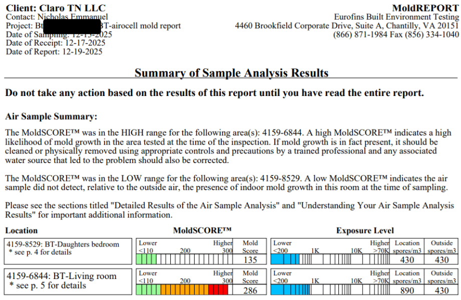 Claro conducted comprehensive air quality testing to locate the hidden source of the family's mycotoxin exposure. The results revealed significant contamination that had been growing silently for two years.