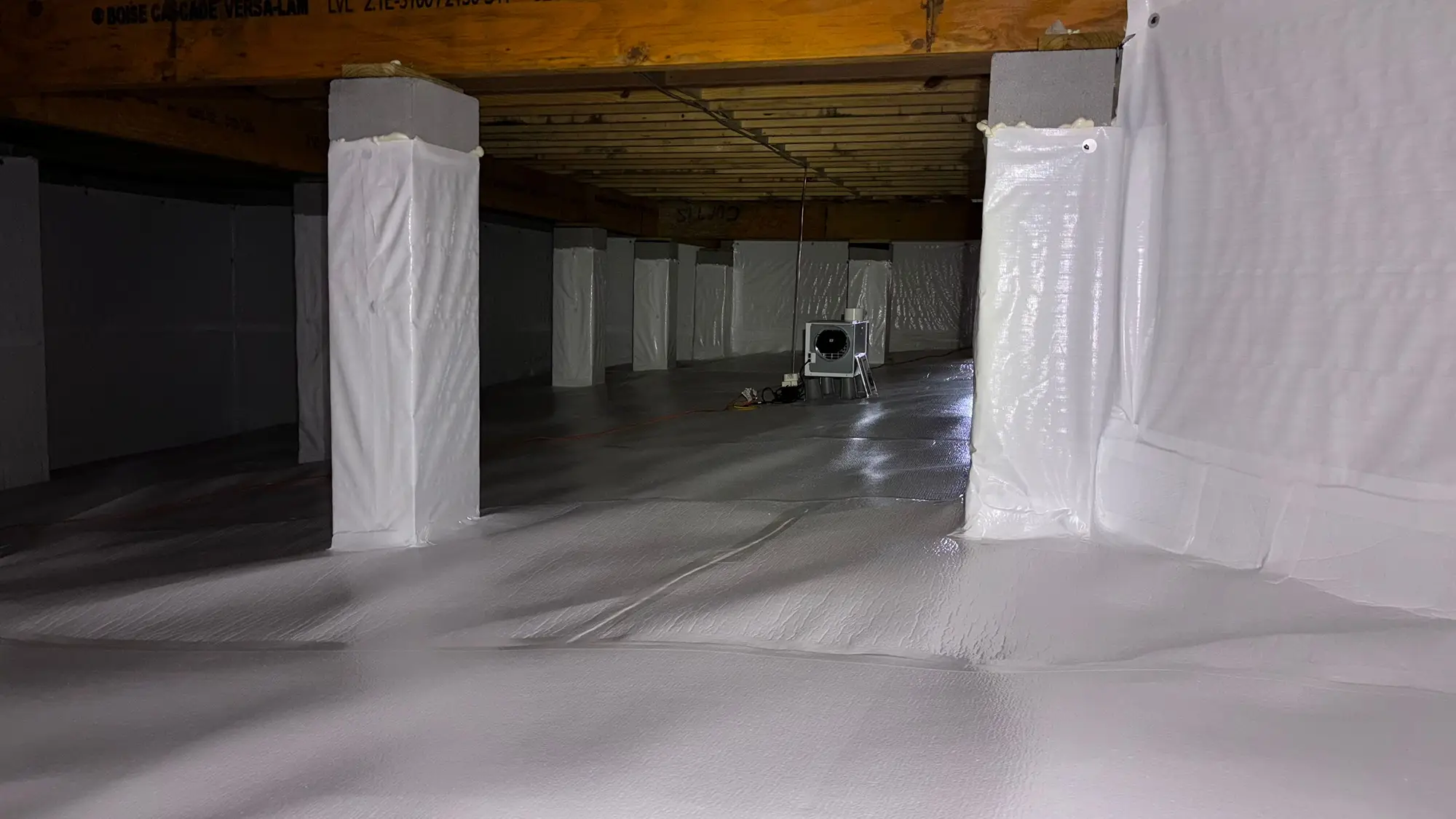 We install a heavy-duty vapor barrier across the entire floor and up the foundation walls. All seams get taped and sealed, then we close off the foundation vents permanently.